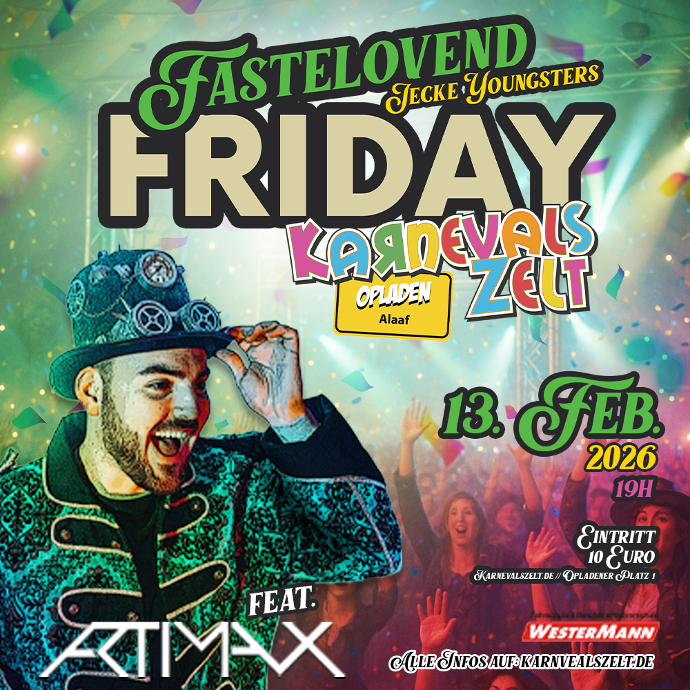 Fastelovend Friday Am 13. Februar 2026 (19 – 24h) heisst es wieder Jecke Youngsters Party mit Actimax im Karnevals Zelt Opladen. Die Tickets dafür bekommt Ihr auf diesem Link, bei Lotto am Markt in Opladen oder bei actimax Tickets Facebook Instagram Impressum Datenschutz